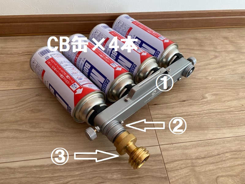これは中々に使えるヤツで、250g入りのカセット缶を4本まとめて使用できるもの。当然それぞれの缶から少量づつ供給されるので気化熱で冷え込むことが少なくなり、火力が安定するわけだ。4本揃ってなくても動作する優れもの。