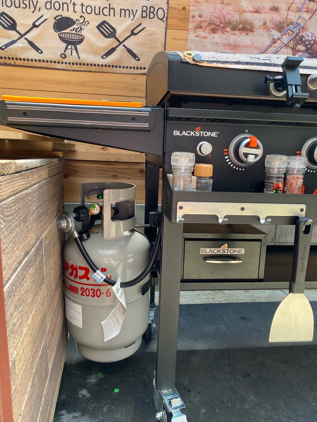 本来Blackstoneグリドルではプロパンガスを使用しなくてはならないが、プロパンガス導入を怖がっていた家人をなだめるためにも、馴染みのあるカセットガスを最初に用意したのだ。もちろん誰もやったことがない方法だから、やってみないと実用火力がでるかどうか不明だし、Blackstone製品にブタンガスを使うのはメーカー保証外となる。しかし、日本では元々保証が受けられないので全然気にせずに実験出来た。